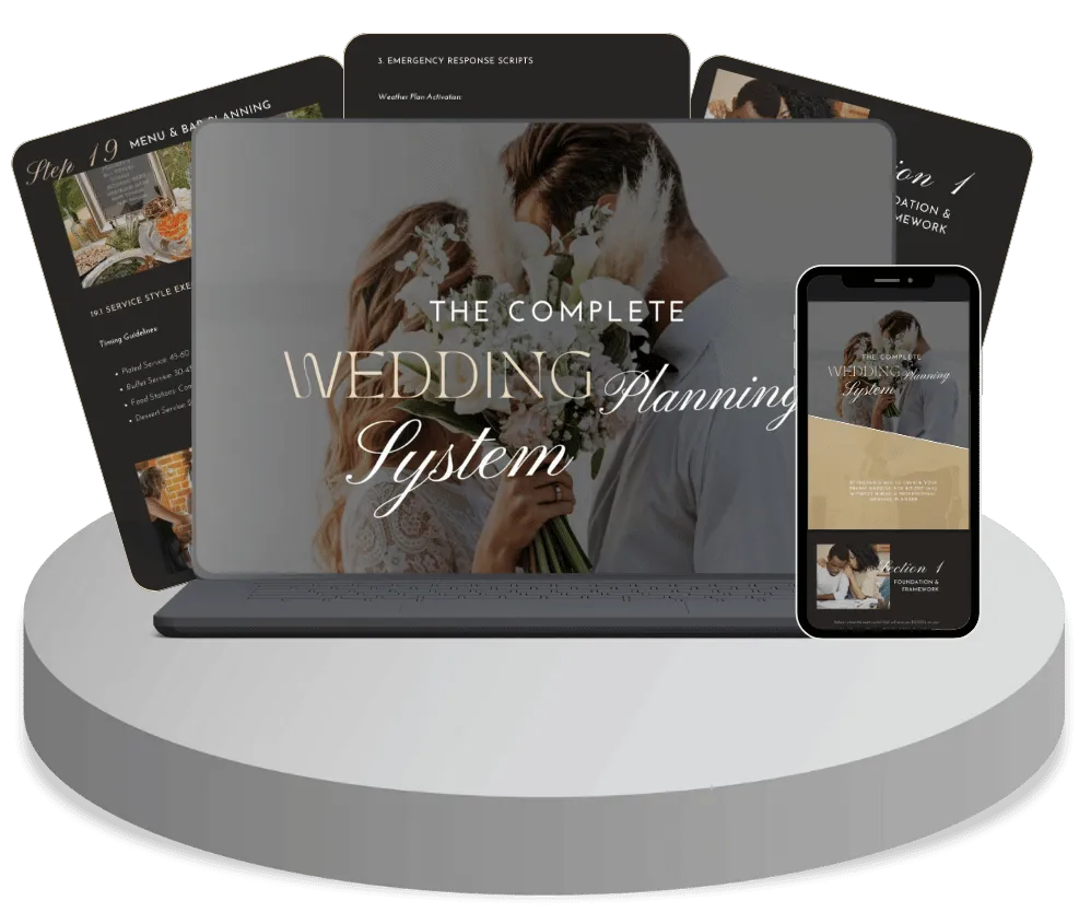 Get our proven 27-step system that's helped hundreds of couples create stunning weddings while keeping thousands in their pocket.